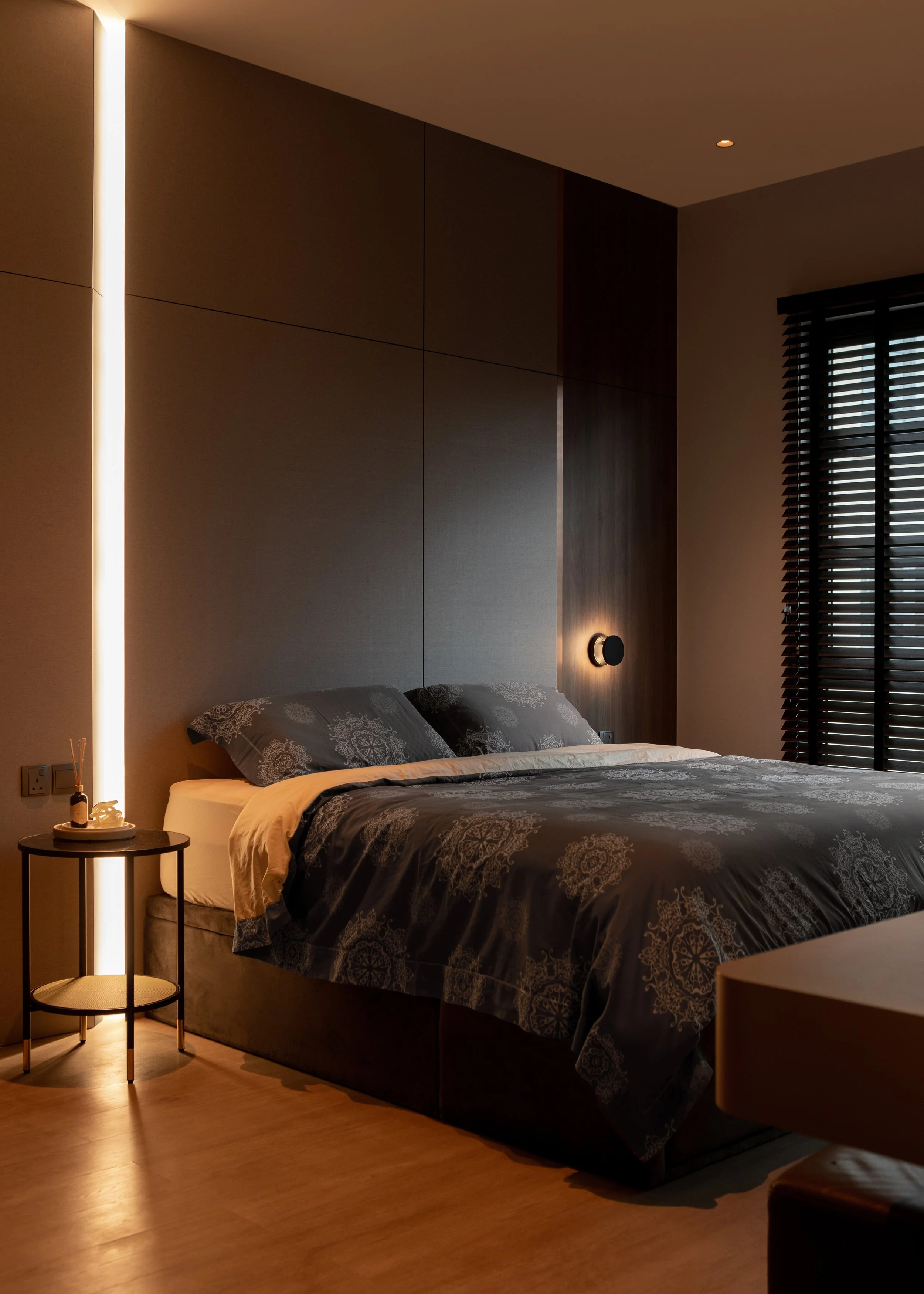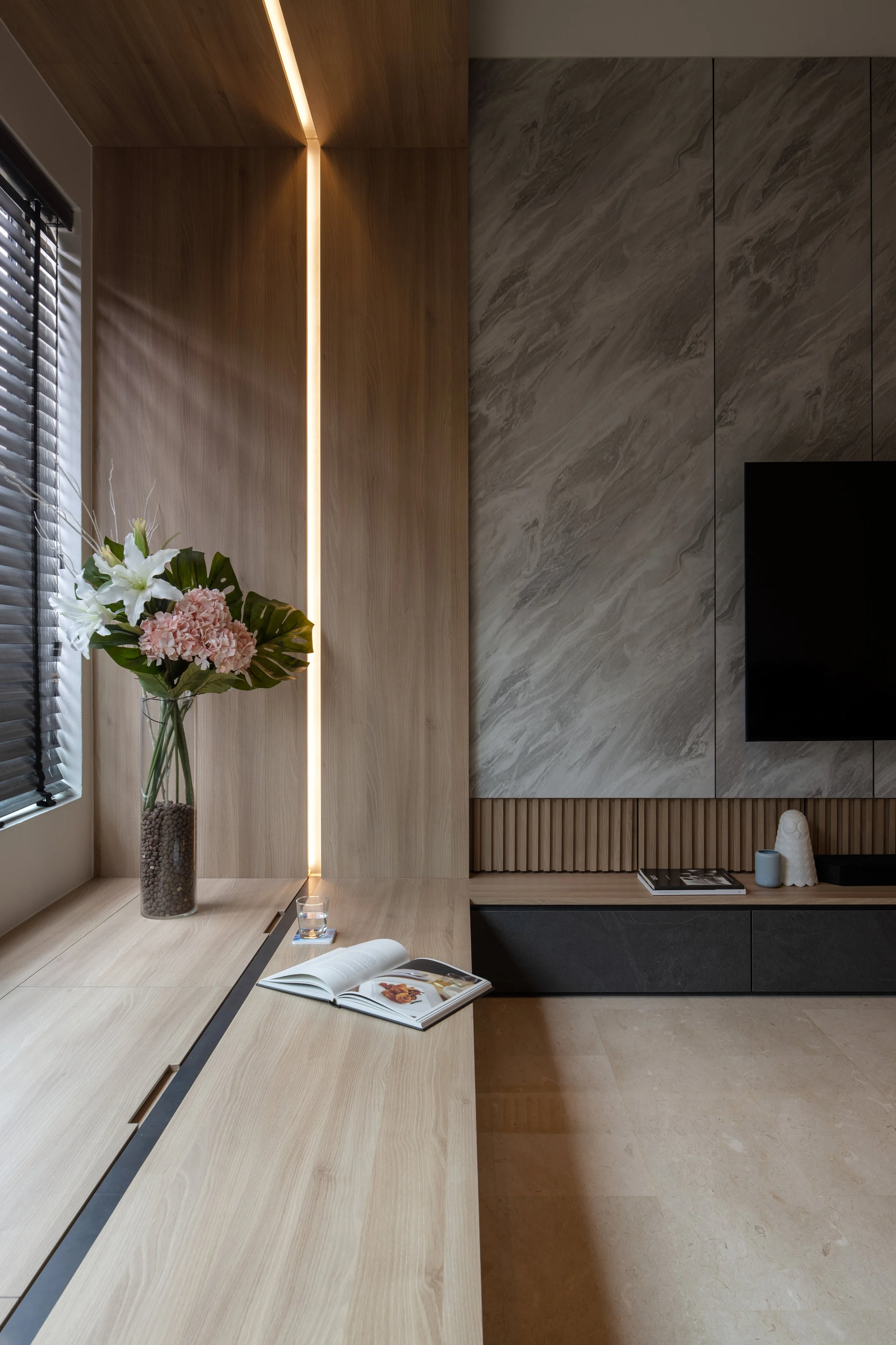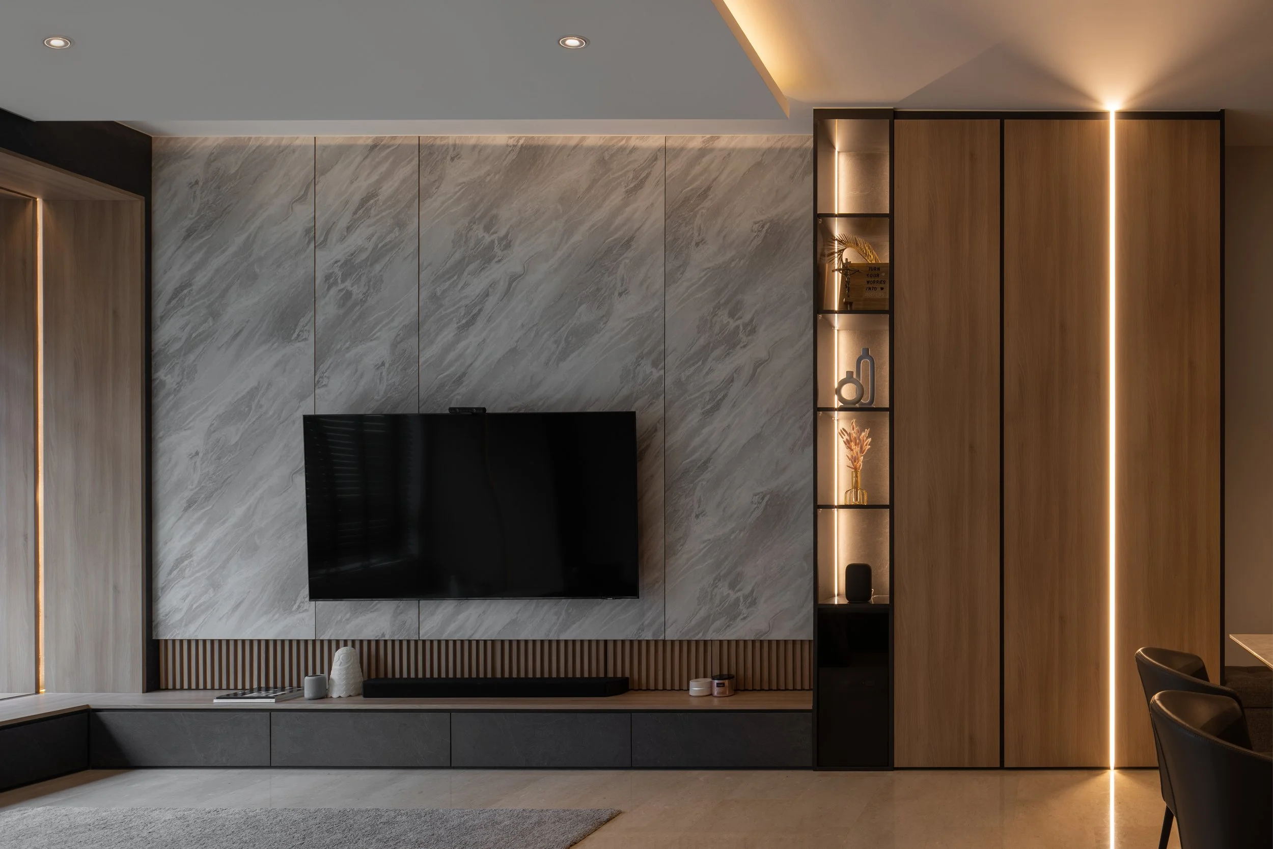 To complement the existing marble flooring, we incorporated fluted paneling with rock and marble finishes, ensuring a cohesive and modern aesthetic that harmonizes with the selected furniture pieces.