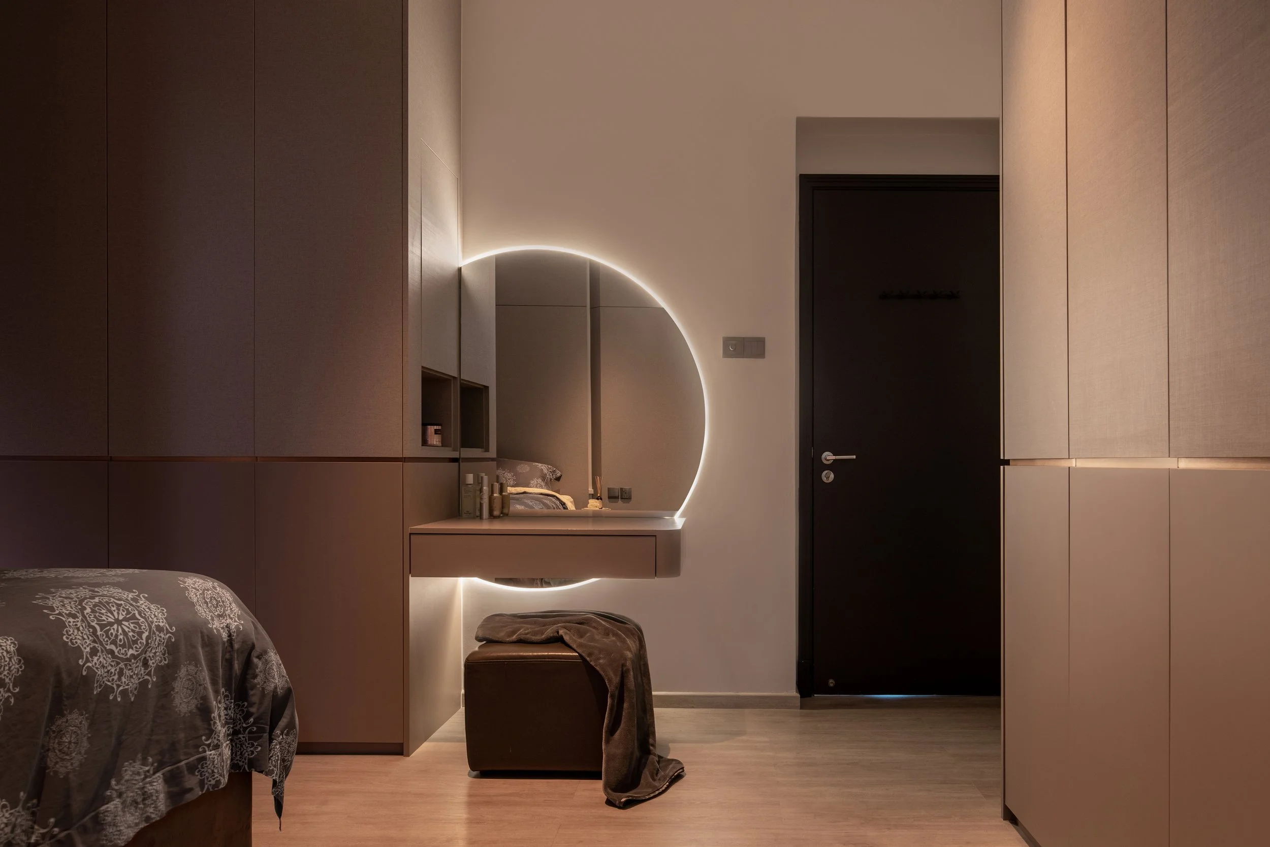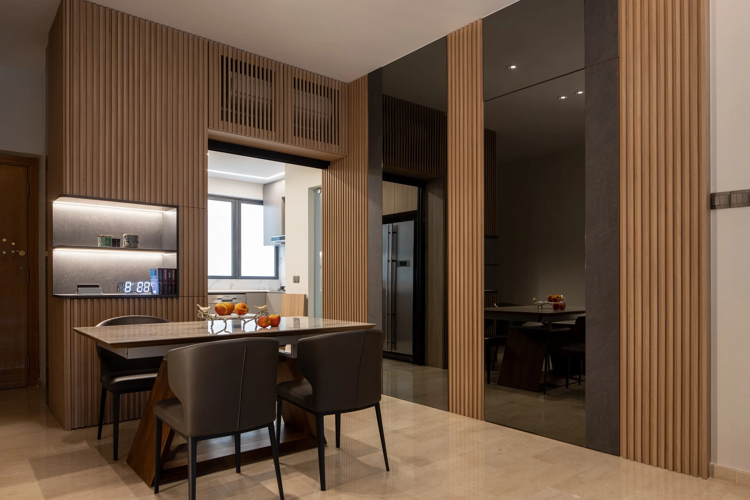 The modern approach of using fluted panelling with rock & marble finishes were used to tie in the existing marble flooring with selected furniture pieces, ensuring everything worked harmoniously.