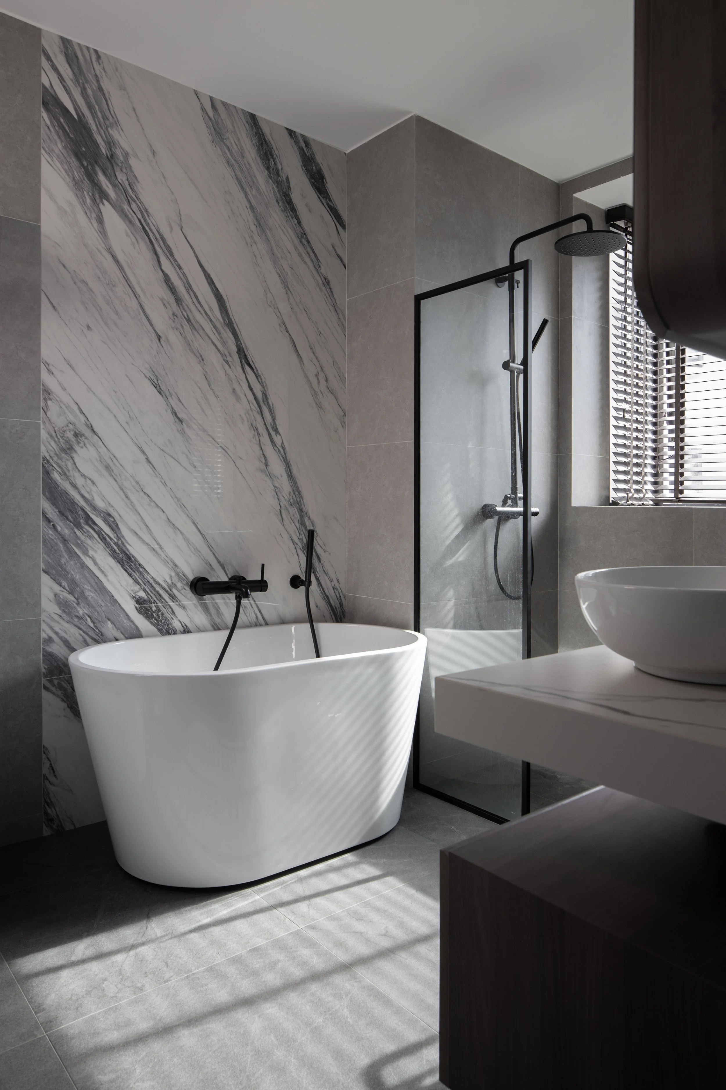 To create an understated sense of luxury, we selected large-format marble tiles as the bathroom’s center piece, complementing the bathtub with natural grey stone tiles and black accents.