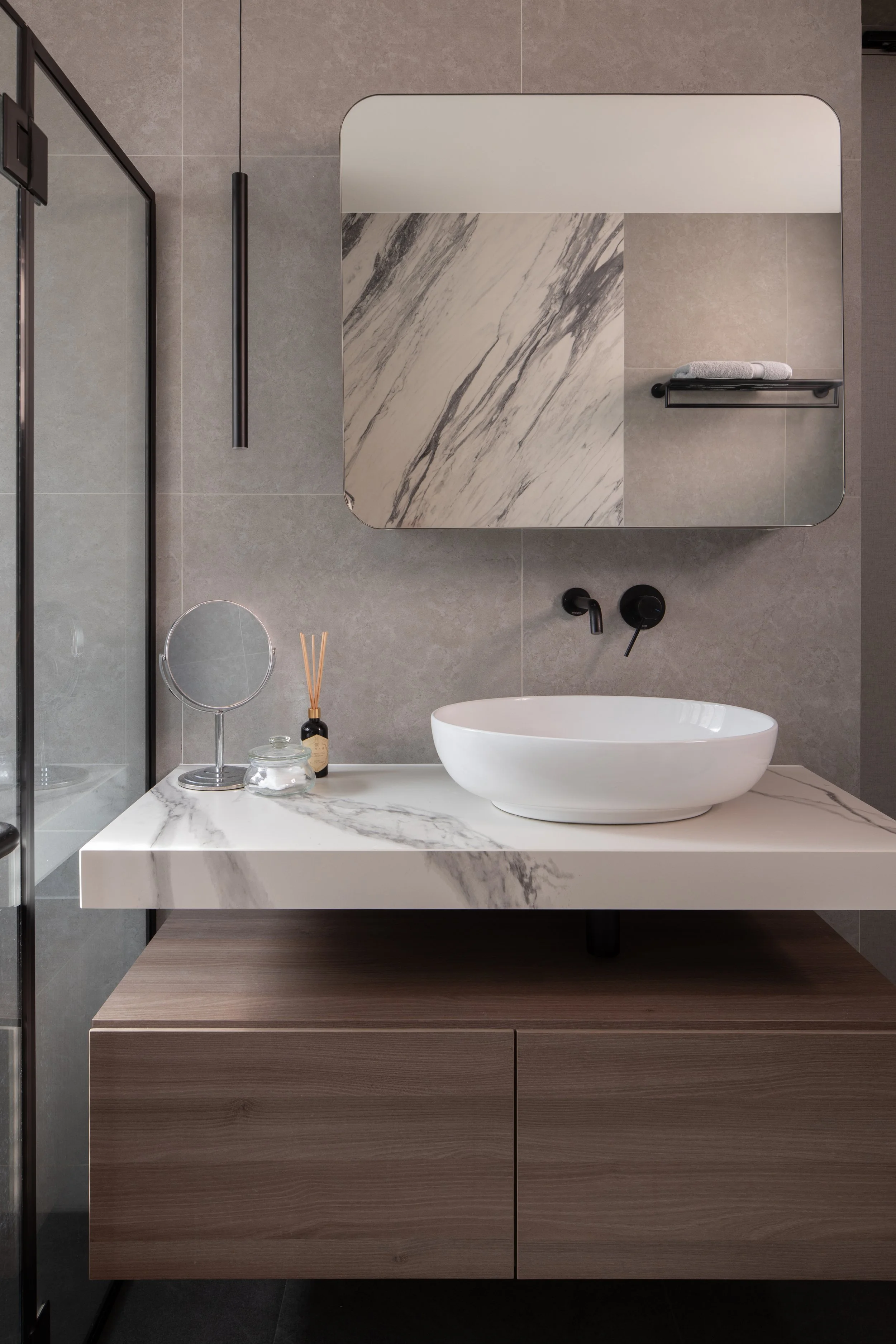 Precision craftsmanship was essential for cutting openings to accommodate the concealed mixer, while black fittings further elevated the bathroom’s premium feel.